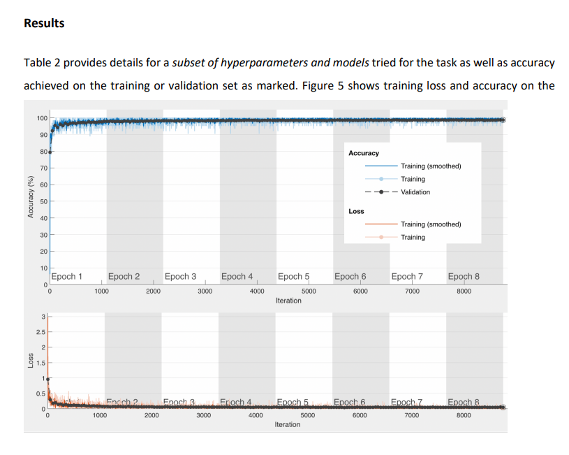 데이터는 기존 데이터셋에서 8:2로 분할(train-test)하여 실행되었으며, ResNet18을 위,아래 layer을 수정한 상태에서 적용하는 것이 효과적이라는 것을 알게 되었다. 환경은 Matlab(매트랩)이었으며, 깊이는 71층 깊이인 ResNet18이 구성되었다. Input은 128 * 128 * 1인 이미지이며 Convolution layer은 이를 7*7 크기, stride 2*2 크기의 컨볼루션을 수행하여 bias 64개를 최종적으로 5개 클래스 중 하나로 WVD 이미지를 분류한다. 그 외 파라미터로는 학습률 0.01, 정규화 0.0001, 미니 배치 사이즈 64, epoch 8이었다.
