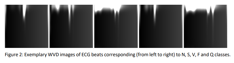특징 추출은 ML 접근 방식에서 필수적인 부분이다. 여기서는 시간에 의존하는(시계열 불러와야 하는) 심전도를 다양한 방식으로 2D 신호로 변환, 특징 매핑을 통해 머신러닝을 진행하려는 것이다. 선행연구를 통해 1D 신호와 레이더 간의 유사성 등을 기반으로 신호 처리를 데이터로 변환하기 위한 WVD(위그너 빌 분포)를 적용하였다. WVD는 시간과 신호의 주파수 변화를 단일 종합 측정할 수 있는 방법론 중 하나로, 정보 손실이 적고, 시간/주파수가 공변수이며 팽창을 보존하는 특성이 있어 여기서는 2D CNN으로 1D 비고정 신호를 분류하는 데 사용하였다.