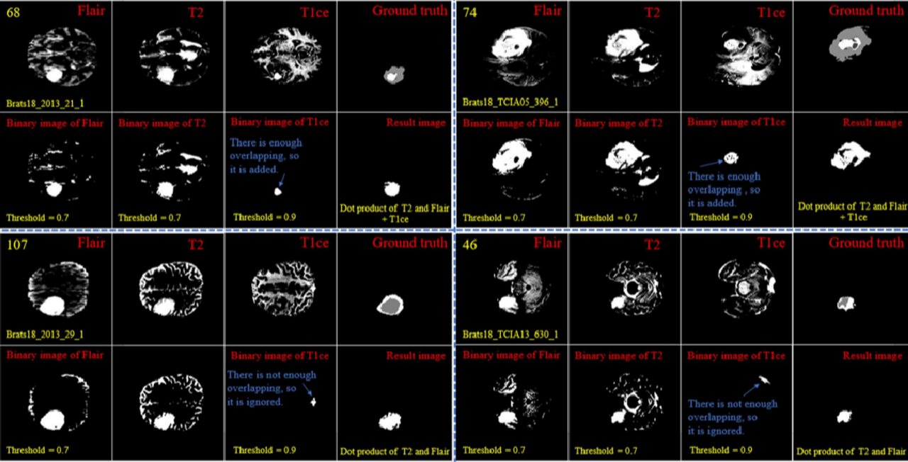 - 이때 T1ce와 dot product of FLAIR, T2 내부의 binary object가 겹치는 영역이 20 pixels보다 큰 것만 고려한다. (fig 5)