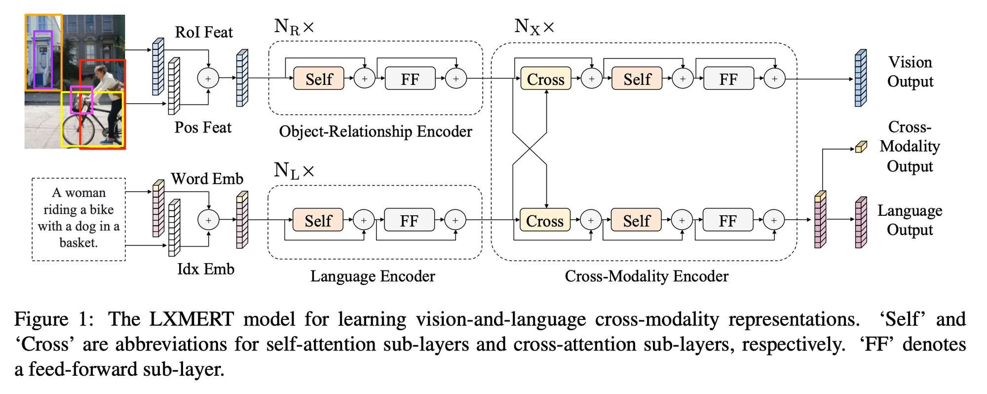 LXMERT의 입력은 단어단위의 문장 임베딩(Word-Level Sentence Embedding)과 object 단위의 이미지 임베딩(Object-Level Image Embedding)의 두개의 시퀀스로 구성