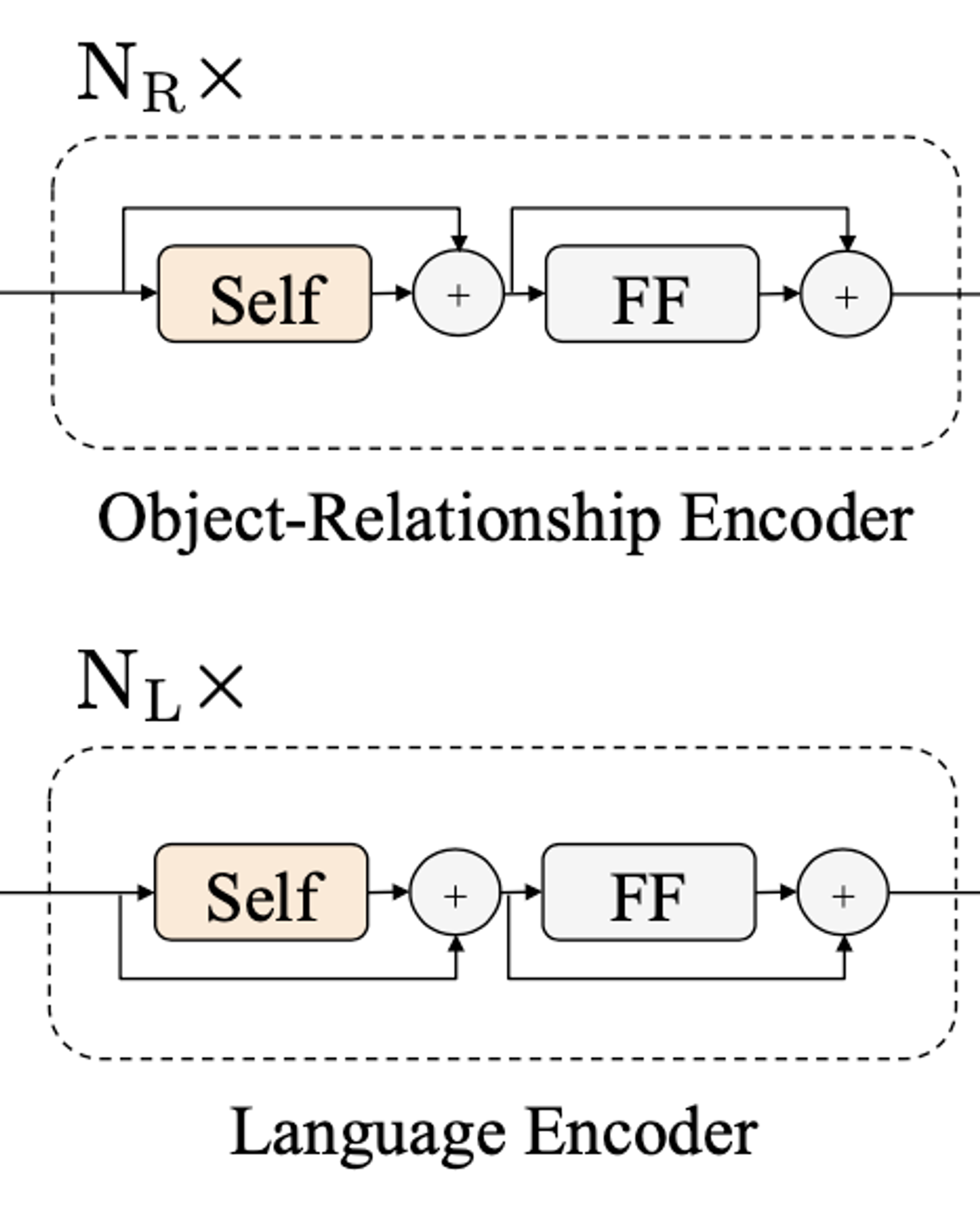 - 임베딩 layer를 거친 두 개의 입력(Word/Object)는 각각 독립된 두개의 Transformer 인코더(Language encoder, Object-relationship encoder)에 의해 인코딩