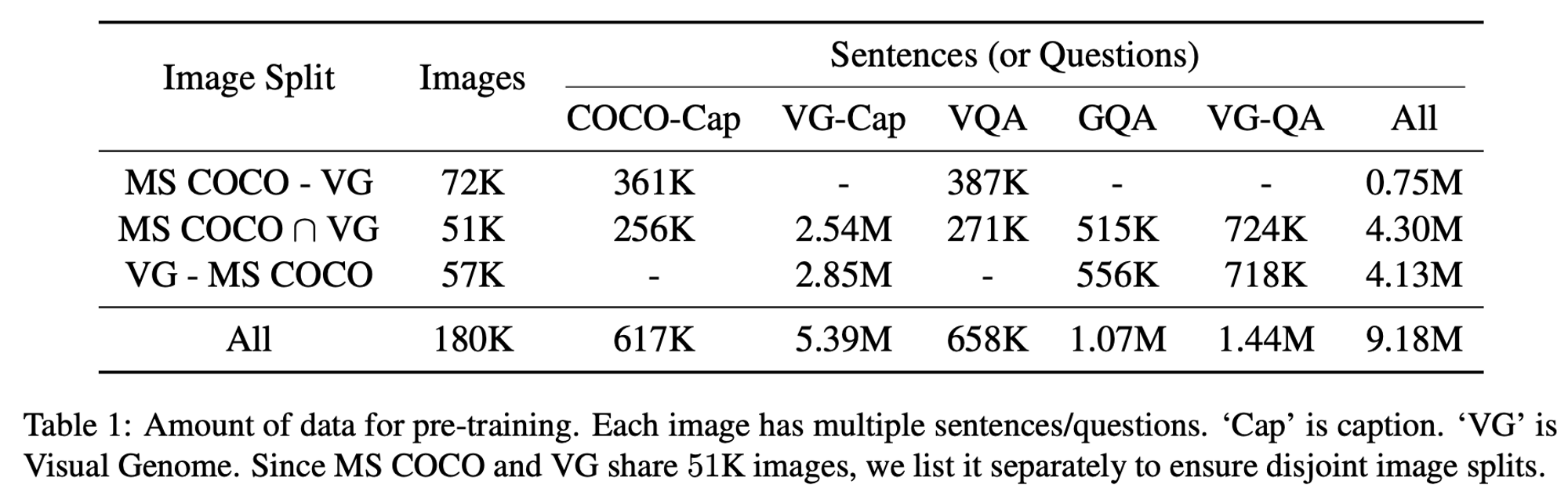 COCO=Cap, VG-Cap, VQA, GQA, VG-QA 다섯 가지의 데이터셋을 이용해 사전 학습을 진행