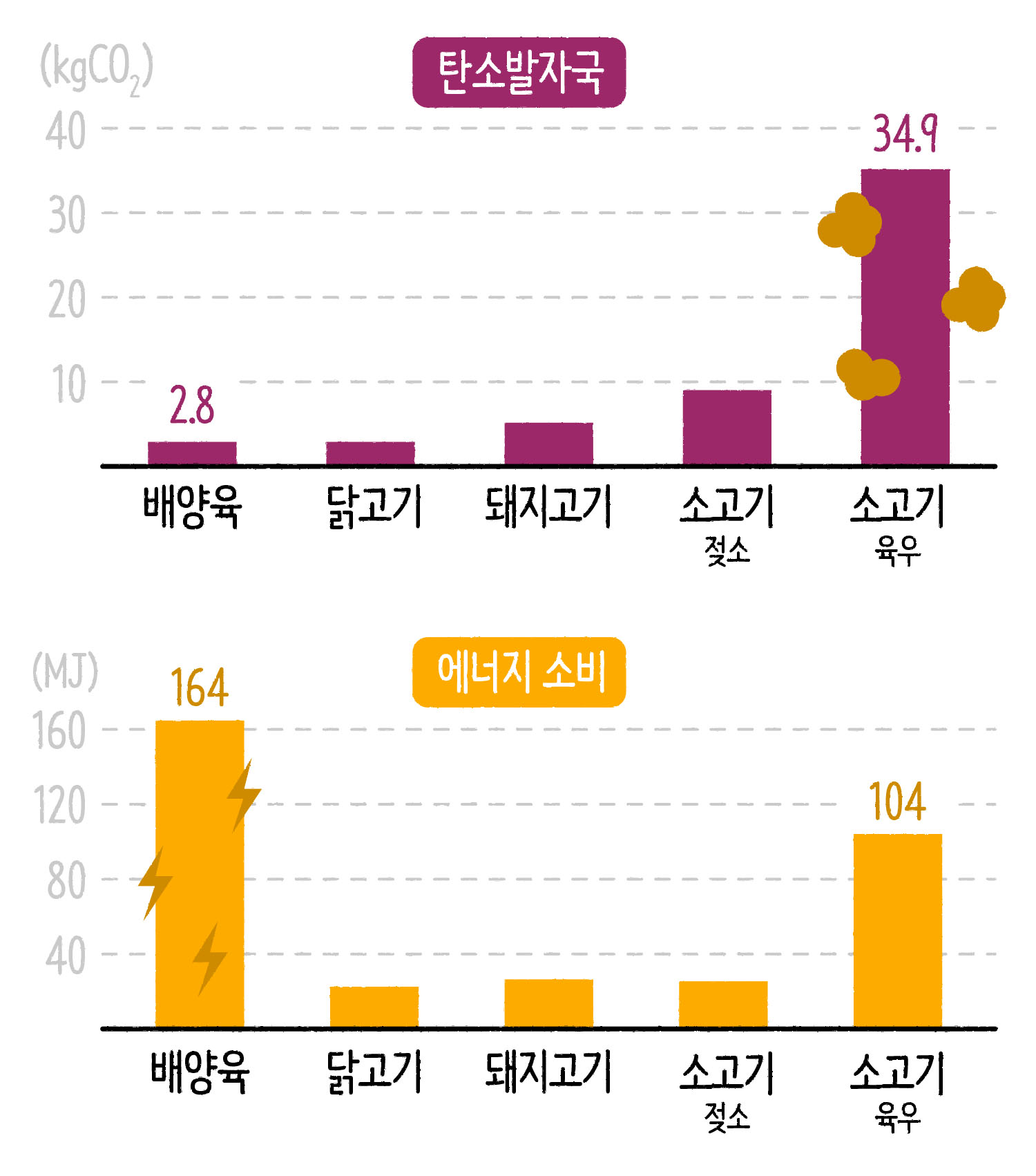 그중에서도 가성비가 좋지 않은 건 소고기야. 우리가 소고기로 단백질 1㎏을 섭취한다고 했을 때 발생하는 탄소는 무려 498.9㎏! 반면 비건 제품들은 탄소배출량이 적어. 식물성 대체육의 탄소배출량은 소고기 대비 93%나 낮아. 동물성 식품 중에 식물성 대체육보다 배출량이 적은 건 야생 참치와 곤충 정도뿐이야. 실험실에서 배양하는 배양육도 식물성 대체육 만치 탄소배출량이 낮아.