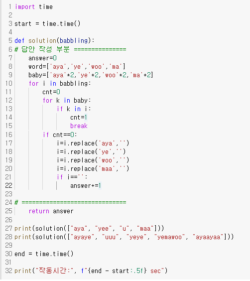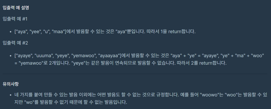 SOL - 조카가 발음이 가능한 4개 문자열이 담긴 배열 ["aya","yee","u","maa"]를 만들고 시작하자. 입력값(문자열)을 받은 후, for문(반복)을 통해 발음 가능 여부를 먼저 비교한다. 이때, 발음이 가능한 문자열을 "o"나 공백 등으로 replace해주자.