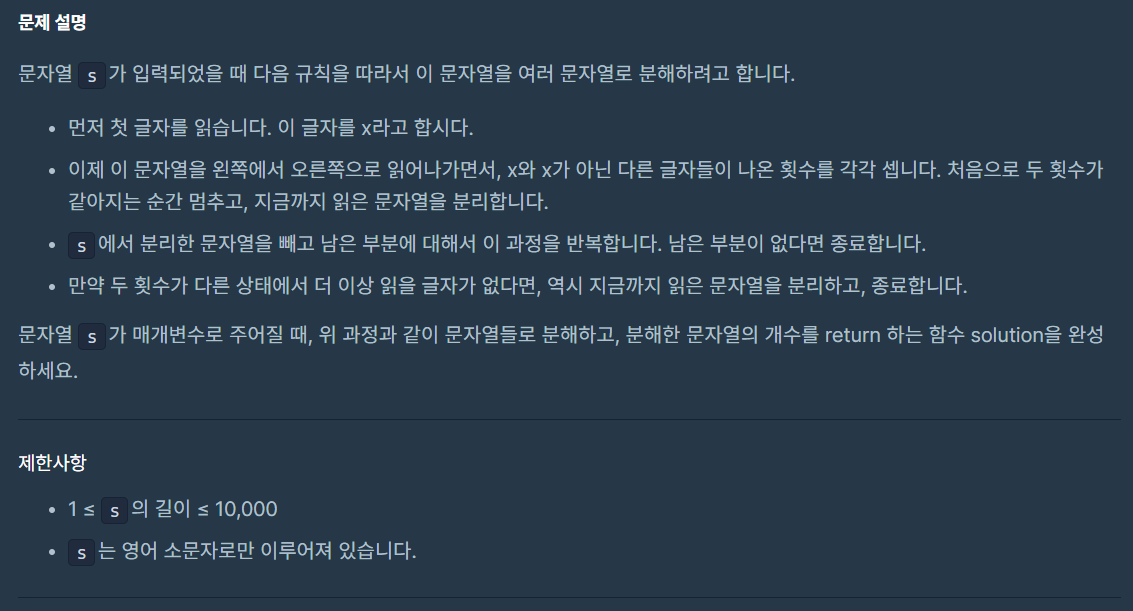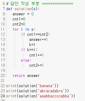 s는 주어진 문자열이며, solution은 내가 정의하는 함수 이름이다. cnt1와 cnt2의 개수가 같아질 때 (cnt1 == cnt2) answer가 +=1 : 1씩 증가하게끔 알고리즘을 구성했고 s라는 문자열을 순회할 k라는 임의의 변수를 가져왔다. 또한, cnt1과 cnt2가 어떻게 늘어나는지(카운트 어케 하는지) k를 활용해 적었다.