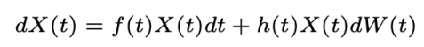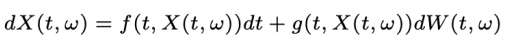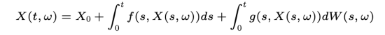 여기서 w(오메가)는 X = X(t,w)에서 random으로 나온 변수이며(랜덤변수), Probability random variable로 X(0,w) = X0의 초기 조건을 갖는다. 또한, 위 식의 f(t,X(T,w)와 g(t,X(t,w)는 모두 실수에 속하며 해당 식을 적분하면 아래와 같이 표현된다.