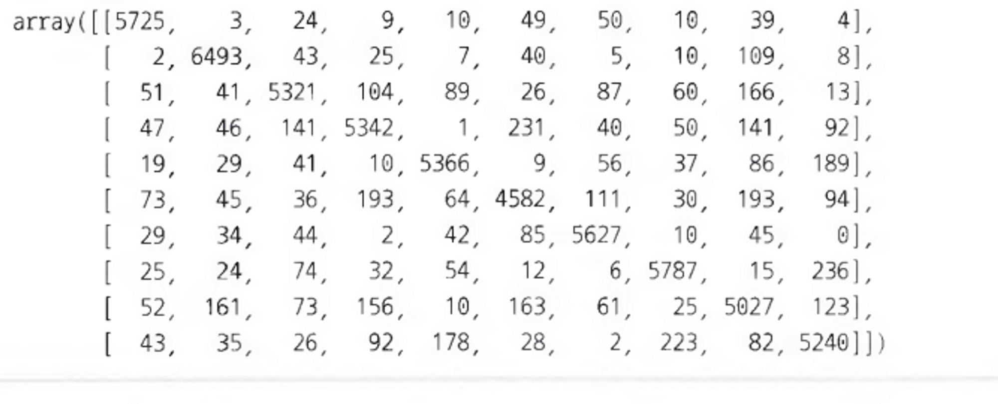 ์ด ์ค์ฐจ ํ๋ ฌ์ ๋๋ถ๋ถ์ ์ด๋ฏธ์ง๊ฐ ์ฌ๋ฐ๋ฅด๊ฒ ๋ถ๋ฅ๋์์์ ๋ํ๋ด๋ ์ฃผ๋๊ฐ์ ์ ์์นํ๋ฏ๋ก ๋งค์ฐ ์ข๊ฒ ๋ณด์ธ๋ค. (๋ฐฐ์ด์์ ๊ฐ์ฅ ํฐ ๊ฐ์ ํฐ์์ผ๋ก, ๊ฐ์ฅ ์์ ๊ฐ์ ๊ฒ์์์ผ๋ก ๋ํ๋จ)