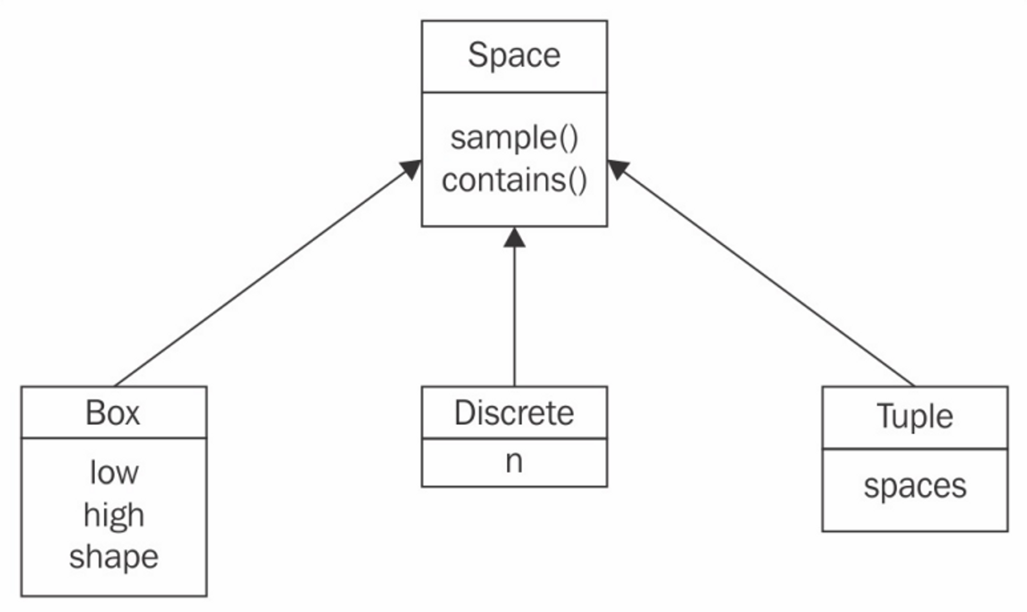 - There are other Space subclasses defined in Gym, but the preceding three are the most useful ones we'll deal with