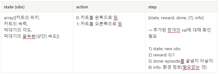 e = gym.make('CartPole-v0') #'CartPole-v0'-> 'CartPole-v1'사용