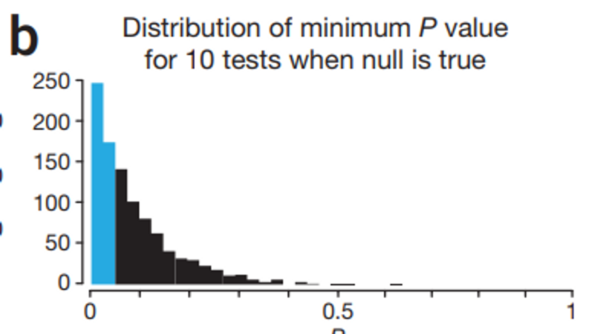k = 10을 사용하면 P < 0.05의 관측 확률은 1 – (1 – 0.05)10 = 0.40 (그림 1b)이다.