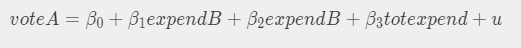 $\beta_1$은 $expendB$ 와 $totexpend$ 가 고정되어있을 때, $expendA$ 가 1단위 증가할 때 $voteA$에 미치는 영향이라고 해석할 수 있는데 $expendA$가 증가하면 $totexpend$가 고정되어있을 수 없다.