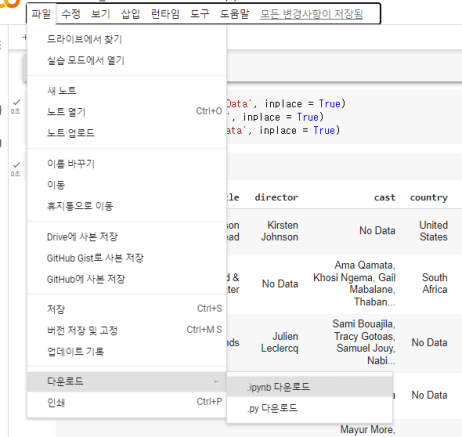 2. 언제든 colab 상에 업로드하면 코드 및 실행 결과를 확인해볼 수 있도록 다운받자. ipnyb와 .py 파일 중 선택할 수 있으며, 나는 파일 - 다운로드 - .ipnyb 다운로드를 통해 다운받았다.