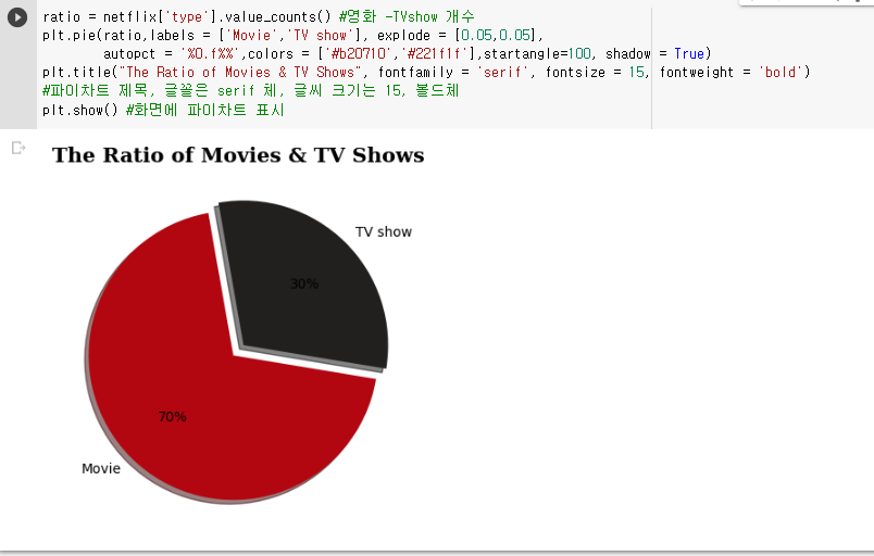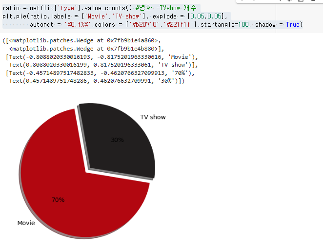 1. 파이 차트 시각화(영화 - TV쇼 비율 비교)