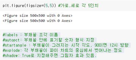 각 옵션은 위와 같다. 이를 기반으로 그린 pie chart를 확인해보면 (plt.pie: 파이플롯이라는 것)