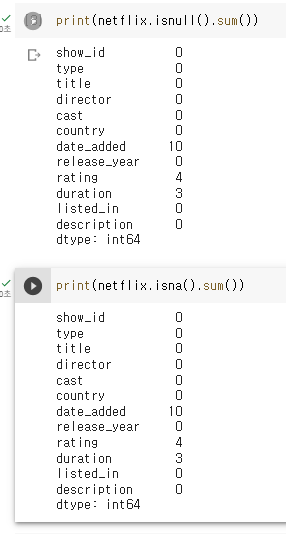 .isnull().sum() : 각 컬럼별 결측치 개수를 반환