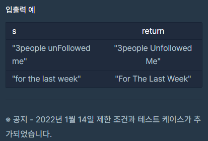 Q. JadenCase란 모든 단어의 첫 문자가 대문자이고, 그 외의 알파벳은 소문자인 문자열입니다. 단, 첫 문자가 알파벳이 아닐 때에는 이어지는 알파벳은 소문자로 쓰면 됩니다. (첫 번째 입출력 예 참고) 문자열 s가 주어졌을 때, s를 JadenCase로 바꾼 문자열을 리턴하는 함수, solution을 완성해주세요. 제한 조건 s는 길이 1 이상 200 이하인 문자열입니다. s는 알파벳과 숫자, 공백문자(" ")로 이루어져 있습니다. 숫자는 단어의 첫 문자로만 나옵니다. 숫자로만 이루어진 단어는 없습니다. 공백문자가 연속해서 나올 수 있습니다.