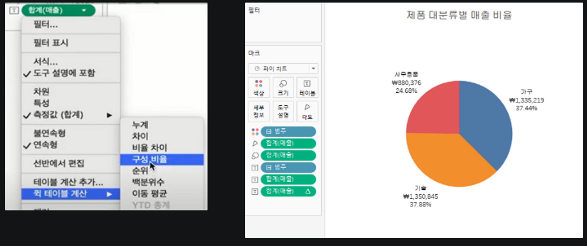 2. 파이 차트 위에 제품 대분류와 매출 표현